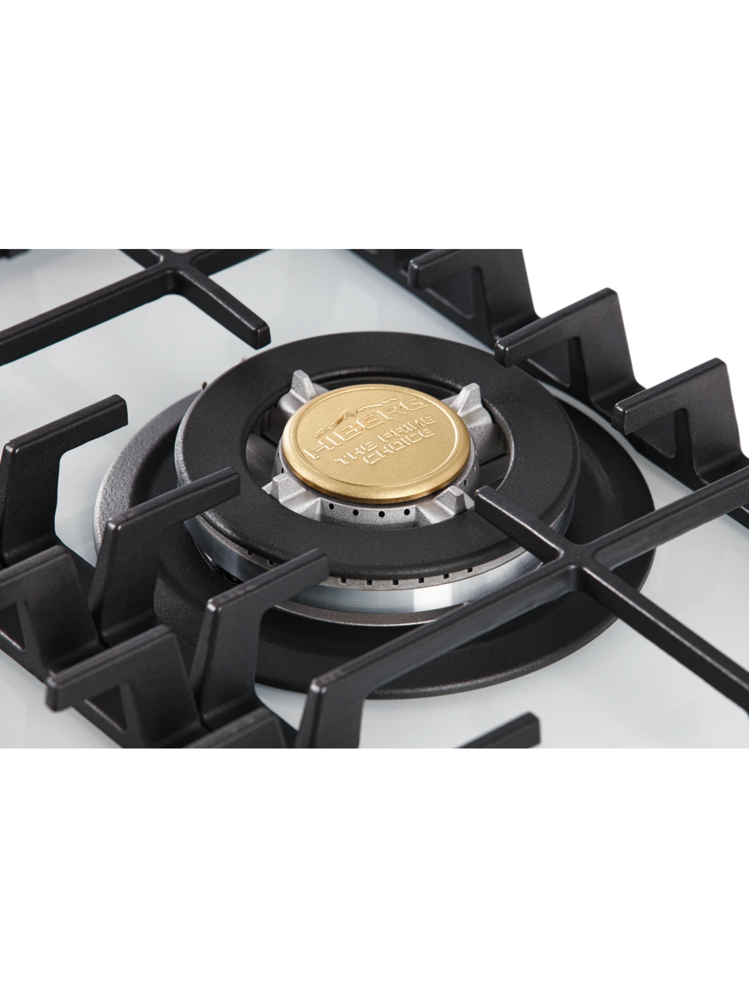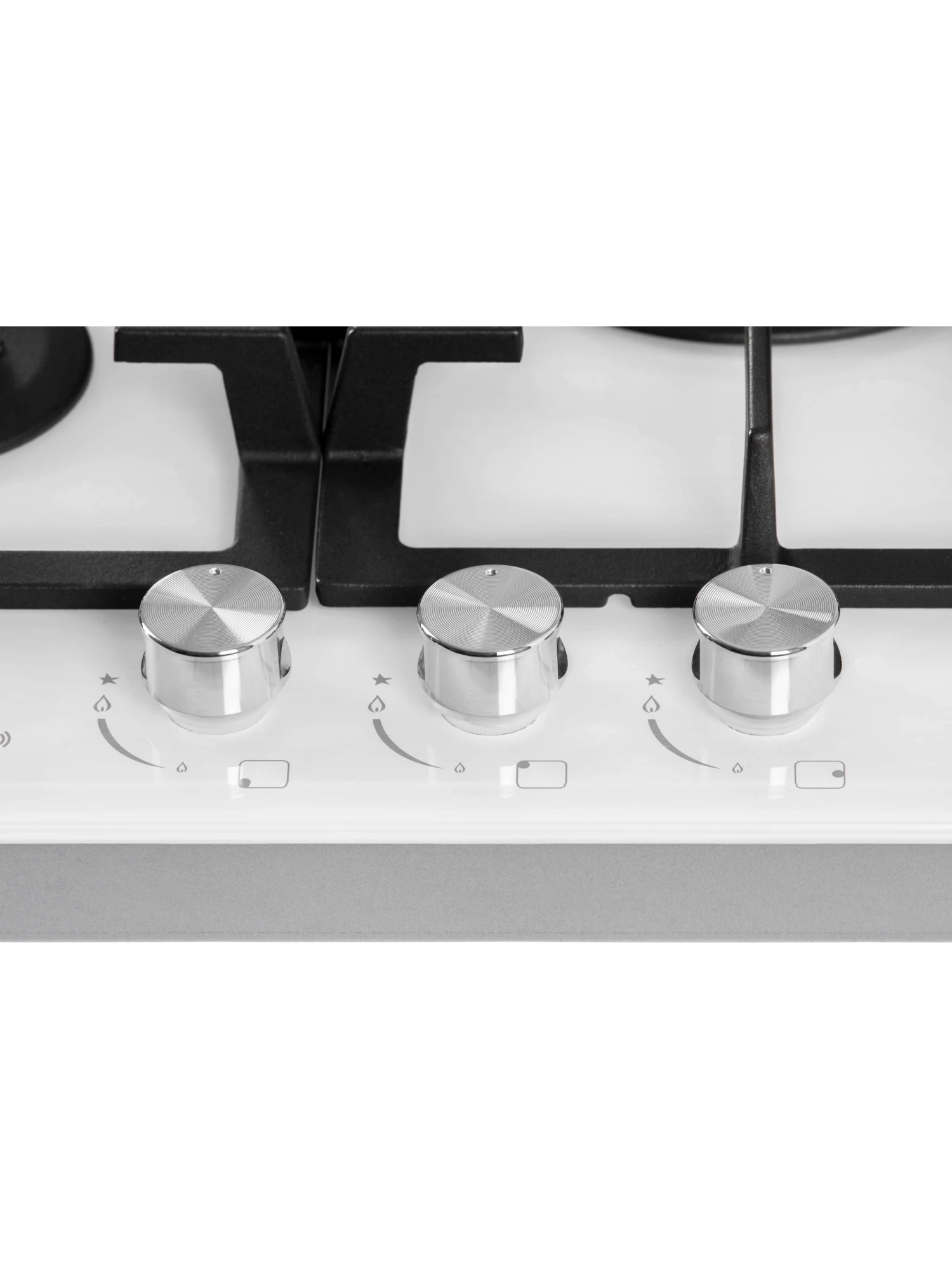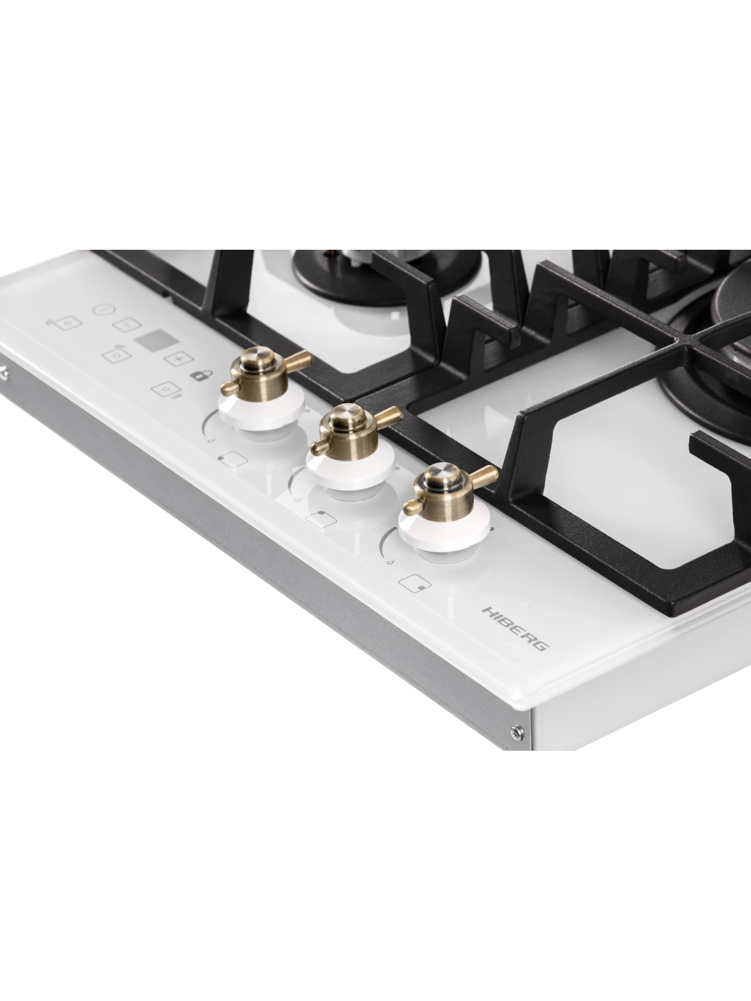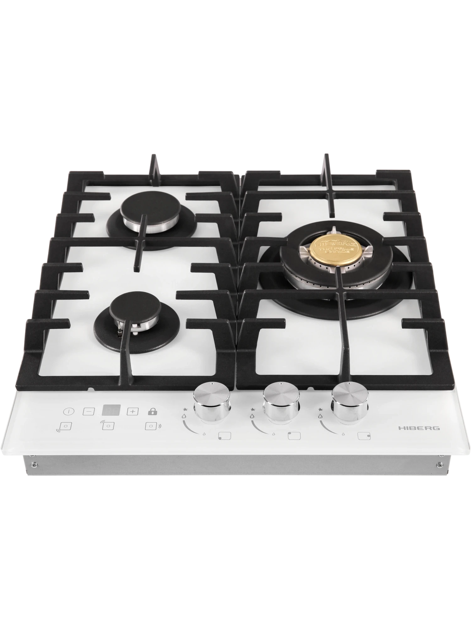 Встраиваемая газовая варочная поверхность HIBERG VM 4535 W из закаленного стекла в белом цвете, оснащена 3 конфорками и функциями: автоматический «электророзжиг», «газ-контроль» и сенсорный таймер отключения газа. Компактная рабочая поверхность выполнена из закаленного стекла – прочного и долговечного материала, на ней располагаются три конфорки разных по диаметру и мощности огня. WOK конфорка мощностью 3,4 кВт позволяет ускорить закипание воды и использовать интенсивную скорость прожарки. Сенсорный индивидуальный таймер отключения газа дает возможность контролировать время готовки каждого блюда. Каждая конфорка будет отключаться именно в то время, которое было задано именно для нее. Таймер устанавливается с диапазоном от 1 до 99 минут, по истечении заданного времени конфорка отключается автоматически. Мощность любой горелки можно регулировать с помощью поворотных переключателей. Для удобства пользования варочной панелью в переключатели встроен «электророзжиг», который позволит одним нажатием руки легко включить нужную конфорку без использования спичек. В варочной поверхности эффективно продумана система безопасности при утечке газа. В случае пролива жидкости на варочную панель или затухания пламени от сквозняка, в конфорке срабатывает функция газ-контроль и подача газа прекращается. Поверх конфорок установлены чугунные решетки новой конструкции: соприкасаясь со стеклянной панелью только спереди и сзади, обеспечивают меньшую нагрузку на стекло и не оставляют царапин. Прочные чугунные решетки удобные в уходе, не подвержены воздействию высоких температур и отличаются длительным сроком службы. Особенности и преимущества: поверхность из закаленного стекла; электророзжиг; газ-контроль; сенсорный таймер; WOK конфорка; улучшенные чугунные решетки; цвет: белый. Варочная поверхность HIBERG подключается к розетке через кабель с вилкой (идет в комплекте). Газовый выход расположен в правом углу. Тип подключения - штуцер (внешняя резьба). Гарантия на варочную поверхность HIBERG – 2 года.