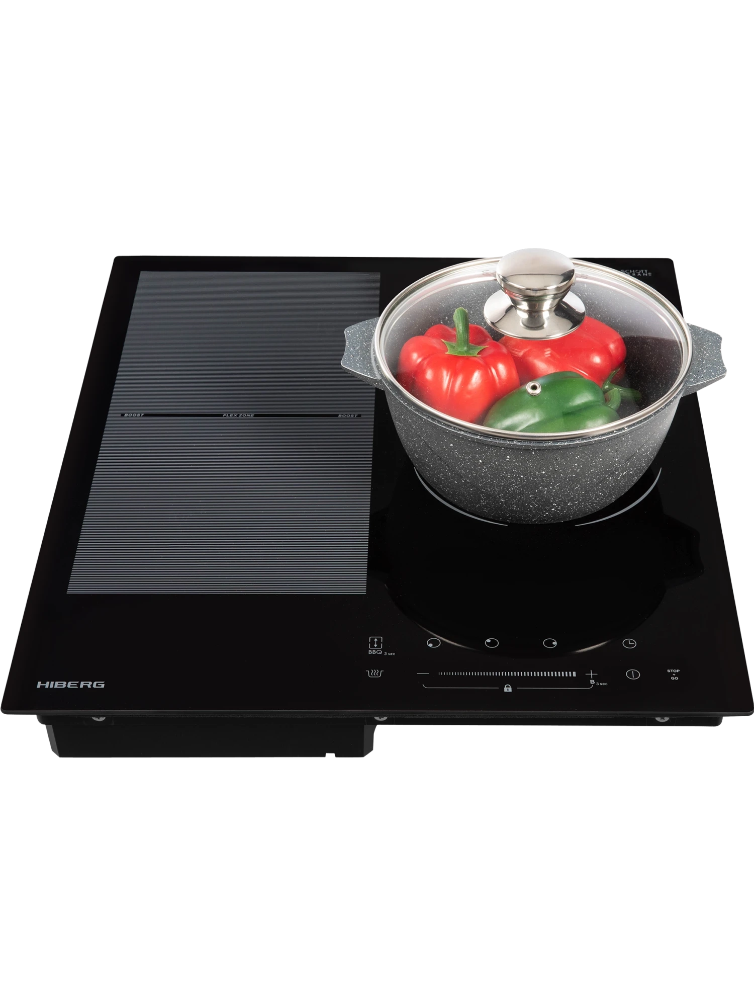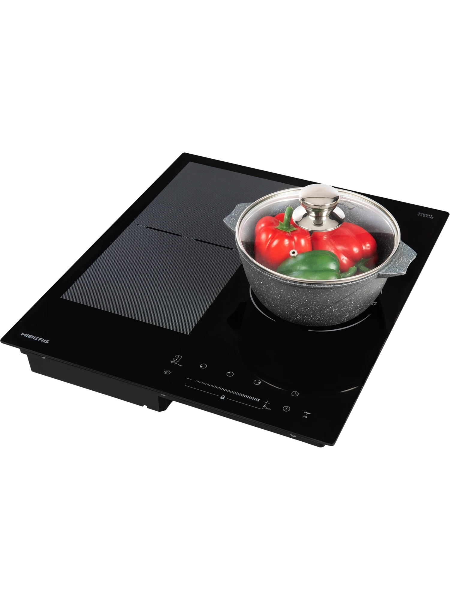 Встраиваемая индукционная варочная поверхность HIBERG i-MS 4539 B выполнена из немецкой стеклокерамики Schott ceran и оснащена 3 конфорками с сенсорным слайдерным управлением. Индукционный нагрев обеспечивает высокую скорость нагрева и экономию электроэнергии. Материал рабочей поверхности в красивом глянцевом черном цвете имеет высокий КПД теплопередачи, механическую прочность, направленную теплопроводность и способность противостоять локальным перепадам температур. Покрытие из стеклокерамики легкое в уходе и очистке. С помощью сенсорного слайдерного управления можно установить индивидуальный таймер и оптимальную мощность нагрева из 9 возможных для каждой конфорки. Слайдерное управление – это современное и удобное решение, достаточно провести пальцем по шкале мощности для выбора мощности. Если вы знаете оптимальное время приготовления блюда - установите таймер с диапазоном от 1 до 99 минут, по истечении заданного времени варочная панель отключится автоматически. Таймер можно установить, как на отключение зоны нагрева, так и для напоминания о том, что готовится блюдо. Функции: Функция Boost ускоряет нагрев и уменьшает время готовки. С мгновенным увеличением подачи мощности на одну конфорку можно за 5 минут вскипятить воду или молоко, приготовить блюда, требующие быстрой обжарки. Функция «Stop & Go» или функция паузы позволяет возобновить готовку. После отмены паузы приготовление вернется на прежние настройки, какие использовались до остановки. С функцией автораспознавания посуды варочная поверхность включится и начнет работу, если на конфорку поставить кастрюлю или сковороду, подходящую для индукционных плит. Возможность объединения зон нагрева позволит поставить посуду нестандартных размеров или сразу несколько небольших кастрюль и сковород. Функция «Подогрев» позволит поддержать температуру только приготовленного завтрака или ужина без затрат на электроэнергию. Индикатор остаточного тепла предупреждает о том, что поверхность еще не остыла. Автоматическое отключение конфорки сработает, если время приготовления превышает заданный лимит времени, прольется жидкость или температура на поверхности повысится выше заданной отметки. Также нагрев блокируется, если поверхность остается пустой несколько секунд или посуда слишком маленькая. Функция «Замок от детей» исключает возможность случайного включения поверхности детьми. Преимущества: независимая установка; 3 индукционные конфорки; рабочая поверхность – немецкая стеклокерамика Schott ceran; сенсорное слайдерное управление; таймер до 99 минут; функция Boost; Flex зона; функция «Stop & Go»; функция «Подогрев»; автораспознавание посуды; индикатор остаточного тепла; защита от перегрева; блокировка от детей. Гарантия на варочную поверхность HIBERG – 2 года.