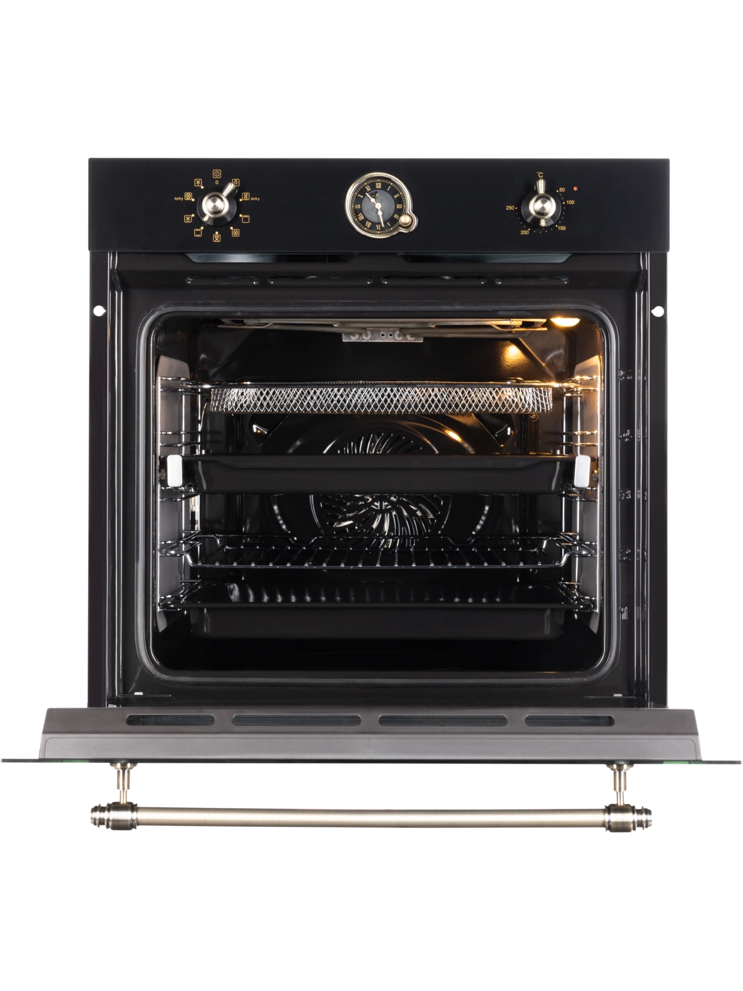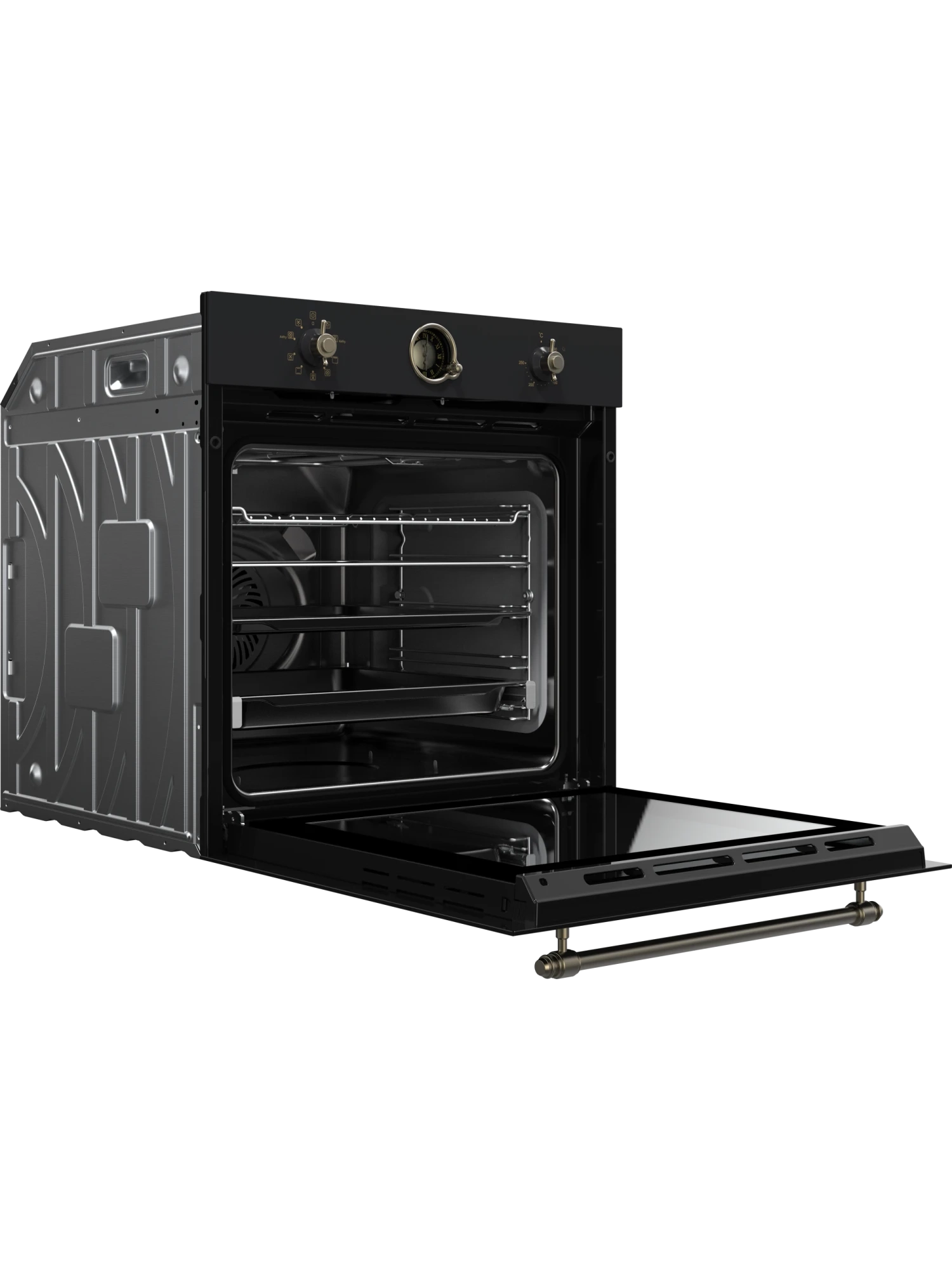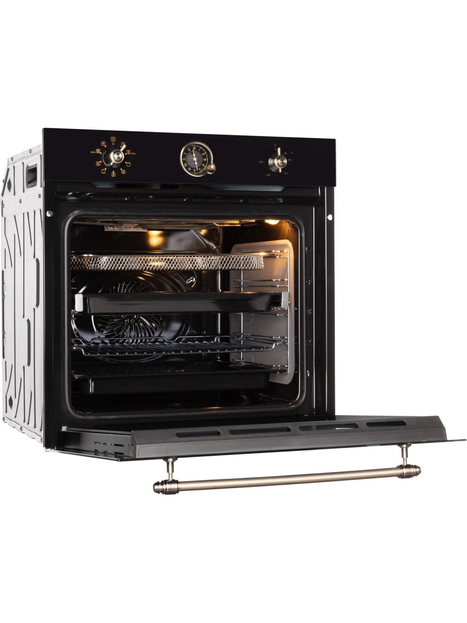 Встраиваемый духовой шкаф HIBERG VM 6392 BR с 9 режимами приготовления, функциями конвекции и гриля оснащен кольцевым нагревательным элементом. Модель объемом 74 л станет отличным помощником для притязательных хозяек. Изысканное исполнение духового шкафа черного цвета позволит сделать его аутентичным дополнением кухонных пространств, созданных в стиле классика, винтаж или прованс. Модель с механической панелью управления дополнена декоративными поворотными переключателями и ручкой дверцы в цвете состаренной латуни. Расположенные на панели управления стилизованные аналоговые часы с программатором помогут настроить автоматическое отключение духового шкафа с учетом времени приготовления блюда. Электрическая духовка с кольцевым нагревательным элементом и функцией конвекции обеспечивает циркуляцию горячего воздуха и равномерное распределение жара. Такая комбинация позволит приготовить сочные блюда из мяса, птицы, рыбу с хрустящей корочкой, пропечь лазанью или получить воздушную румяную выпечку. Режимы и функции Функция 4D-обдува позволит приготовить несколько блюд на разных уровнях одновременно. Благодаря работе кольцевого нагревательного элемента вентилятор равномерно распределяет жар в камере духового шкафа, поддерживая одинаковую температуру и для пиццы, и для мяса. Режим поможет не только приготовить вкусный ужин за короткое время, но и высушит овощи, грибы, фрукты, зелень. Функция гриля с мощным нагревательным элементом позаботится о быстром приготовлении сочной птицы, овощей и сохранении нежной текстуры под хрустящей корочкой. Гриль также можно использовать для создания корочки у блюд, требующих предварительного запекания. Режим пиццы задаст оптимальные параметры для приготовления популярного итальянского блюда с насыщенным вкусом. Максимальная температура нагрева духового шкафа в 250°C позволит равномерно пропечь блюда из птицы, мяса или приготовить пироги из капризного дрожжевого теста. Внутреннее оснащение Внутреннее каталитическое покрытие камеры значительно упрощает уход за техникой. Брызги и потеки расщепляются еще в процессе приготовления блюда и сразу сгорают. Все что нужно для ухода – протереть остывшую поверхность влажной салфеткой. Дверца с безопасным тройным стеклом и встроенными вентиляционными отверстиями останется холодной во время работы духовки и избавит родителей малышей от поводов для беспокойства. Простая конструкция позволит легко извлечь забрызганные стекла и вернуть их на место после чистки. Удобные телескопические направляющие с полным выдвижением для противней помогут контролировать готовность блюд, не придерживая их руками. Система SOFT CLOSING делает открывание и закрывание дверцы бесшумным и плавным. Использование техники не даст осесть воздушному бисквиту. В комплекте к духовому шкафу идет проволочная решетка, два глубоких противня и специальный сетчатый противень для фритюра. Гарантия на духовой шкаф HIBERG – 2 года.