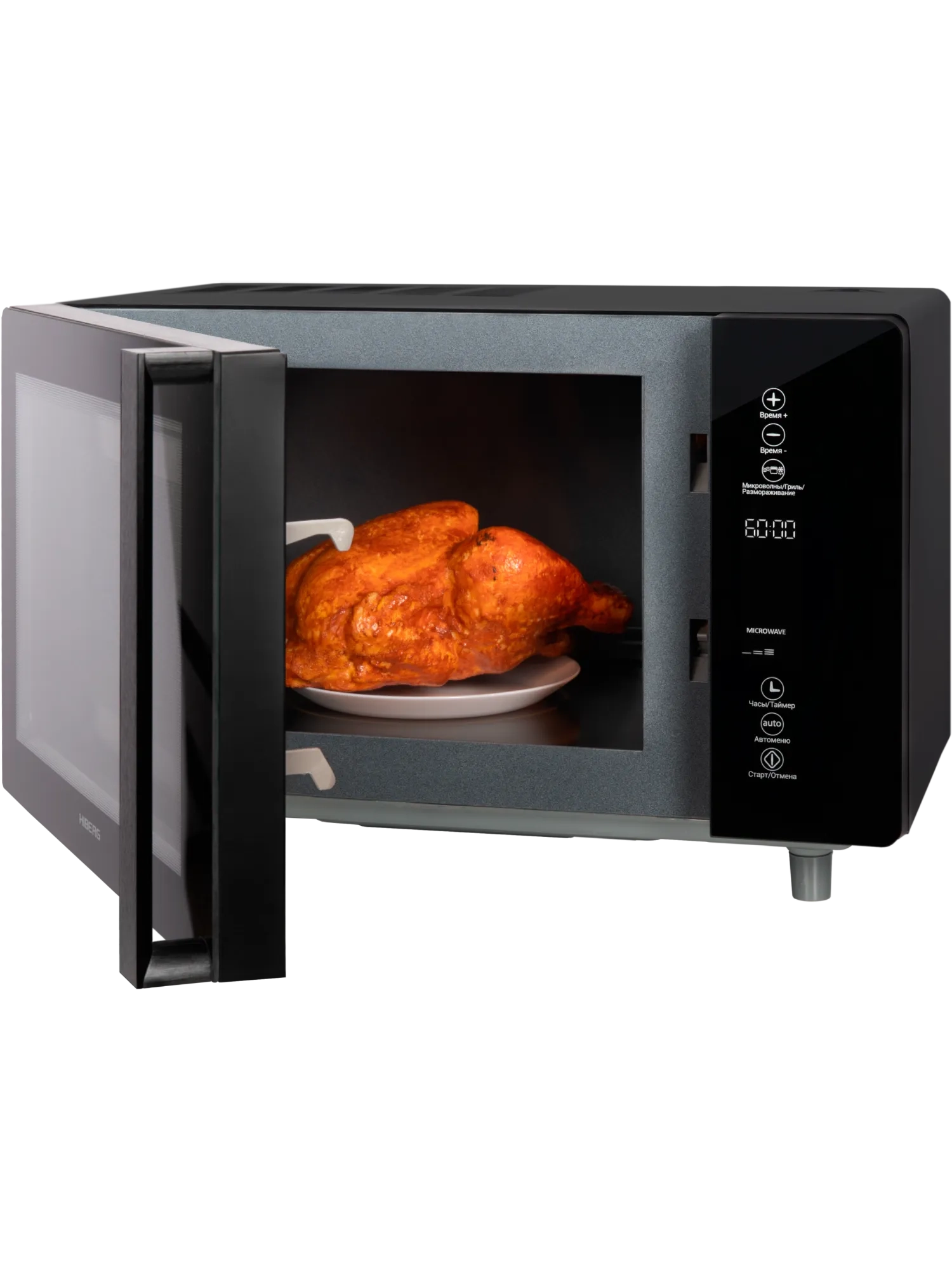 Микроволновая печь HIBERG i-VM 4588 B создана, чтобы сделать ежедневный разогрев и приготовление еды проще и полезнее. Благодаря инверторной технологии, отсутствию поворотного стола и кварцевому грилю модель сама позаботится о горячих блюдах, создавая аппетитные обеды и вкусные перекусы. Лаконичный корпус из черного стекла легко впишется в интерьер, а понятное сенсорное управление сделает использование прибора комфортным для каждого члена семьи. Единство пользы и вкуса Инверторная технология обеспечивает плавную и непрерывную подачу энергии без скачков. Преимущества инверторной микроволновой печи: Польза: структура продуктов не разрушается, сохраняется естественная влага и витамины. Вкус: равномерная разморозка и прогрев блюд без пересушенных краев и холодного центра. долгий срок службы и экономия ресурсов. Свобода действий и простой уход Микроволновое излучение подается снизу и равномерно рассеивается, обеспечивая быстрый и качественный прогрев пищи без вращения стола. Использование ровного стеклокерамического дна упрощает процесс разогрева и приготовления блюд. Чем удобна микроволновая печь без поворотного стола: использование любой посуды, в том числе различной формы и нестандартных размеров; одновременный разогрев - площадь дна позволяет разместить сразу несколько чашек или тарелок; легкий уход – идеально гладкая поверхность дна очищается легким движением салфетки. Внутренняя камера свч-печи объемом 25 литров имеет прочное эмалированное покрытие, устойчивое к высоким температурам и царапинам. Помощник на каждый день Функционал СВЧ подобран так, чтобы в ней можно было готовить большинство любимых блюд: 5 уровней мощности микроволн (до 900 Вт) для деликатного томления, быстрого разогрева или приготовления; кварцевый гриль (1200 Вт) поможет быстро запечь овощи, приготовить горячие бутерброды или создать аппетитную корочку на мясе; комбинированный режим сочетает микроволны и гриль, ускоряя готовку и улучшая вкус блюд; размораживание с равномерным эффектом и сушка овощей и фруктов; умный таймер для настройки времени начала и окончания готовки, чтобы горячий ужин ждал вовремя. По завершении работы микроволновая печь с грилем подаст звуковой сигнал и отключится автоматически, обеспечивая безопасность и тишину. В комплекте идет надежная металлическая решетка для гриля. Гарантия на микроволновые печи HIBERG – 2 года.
