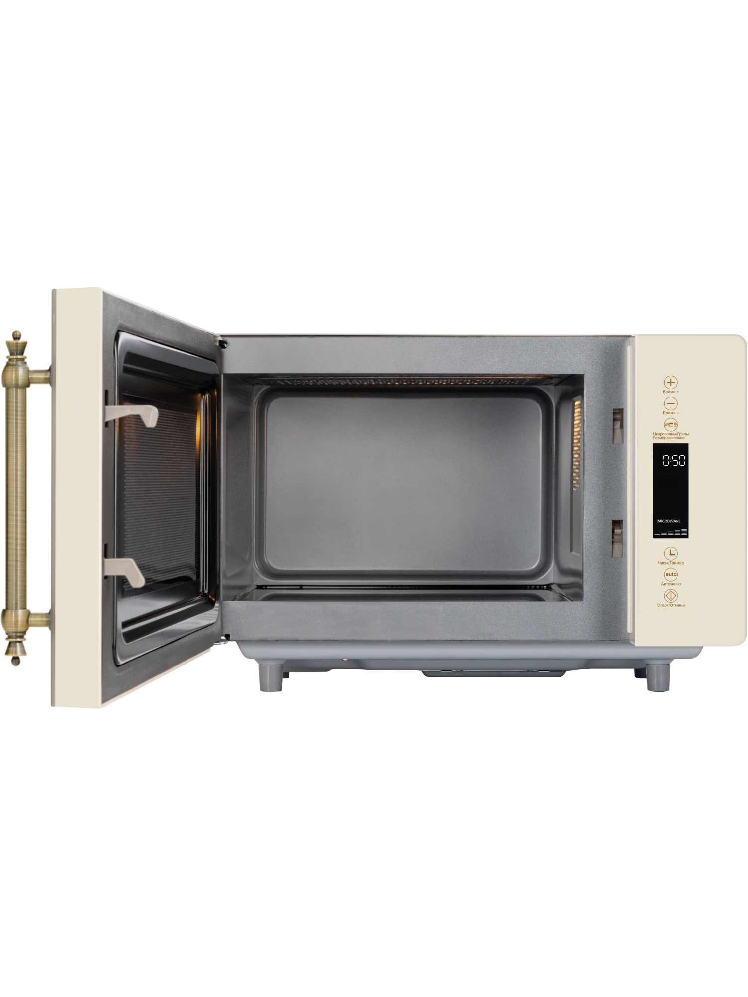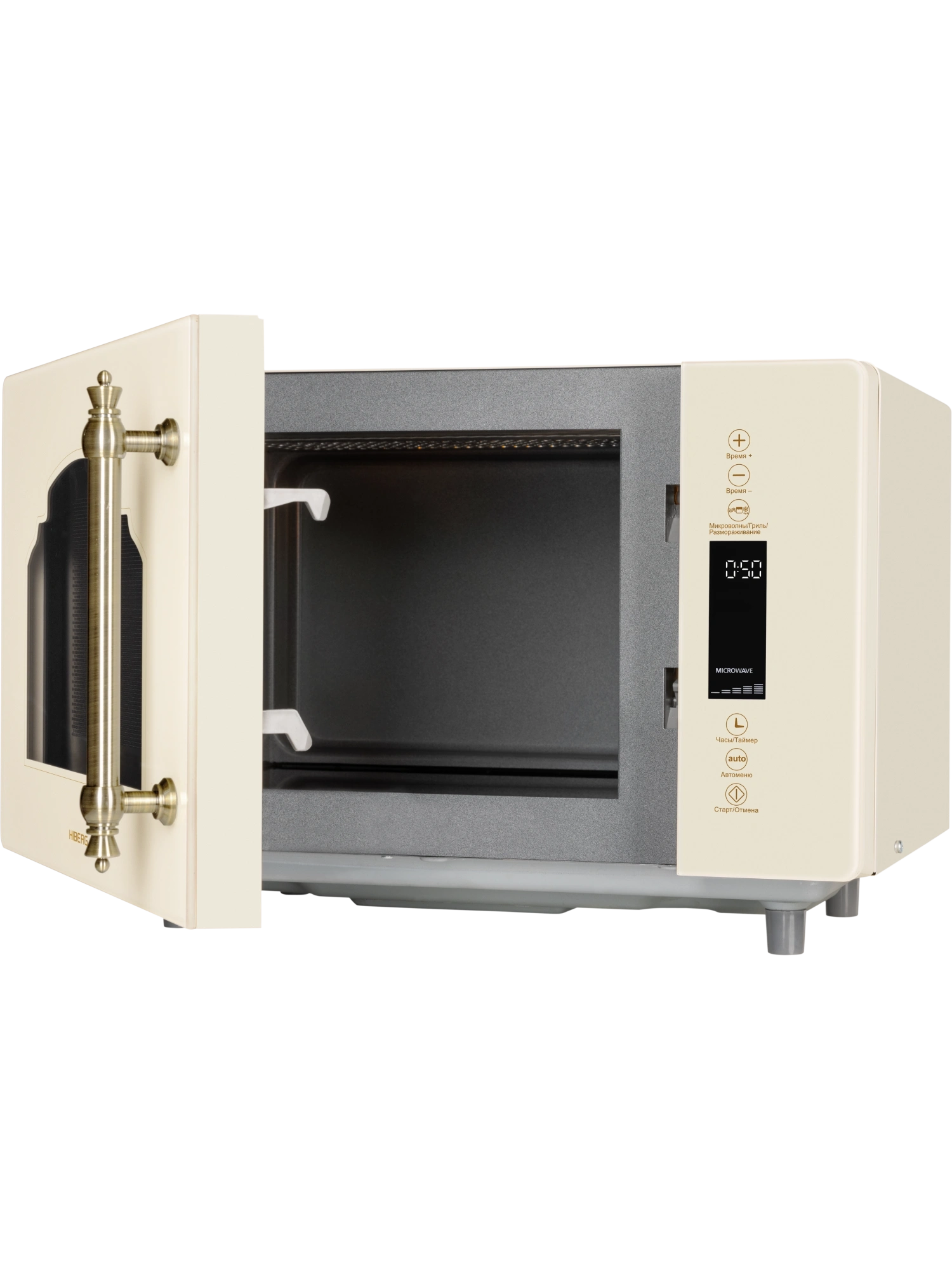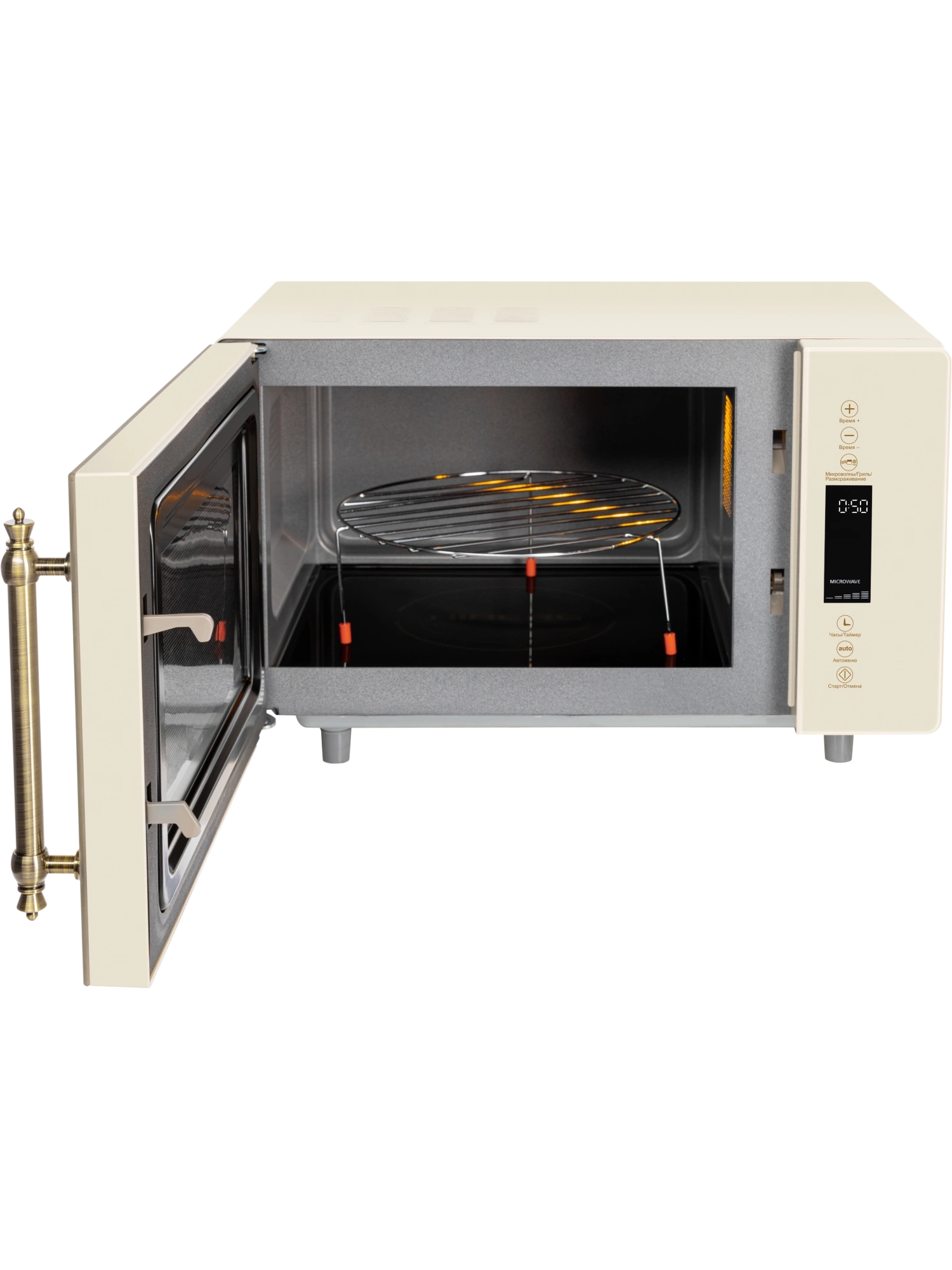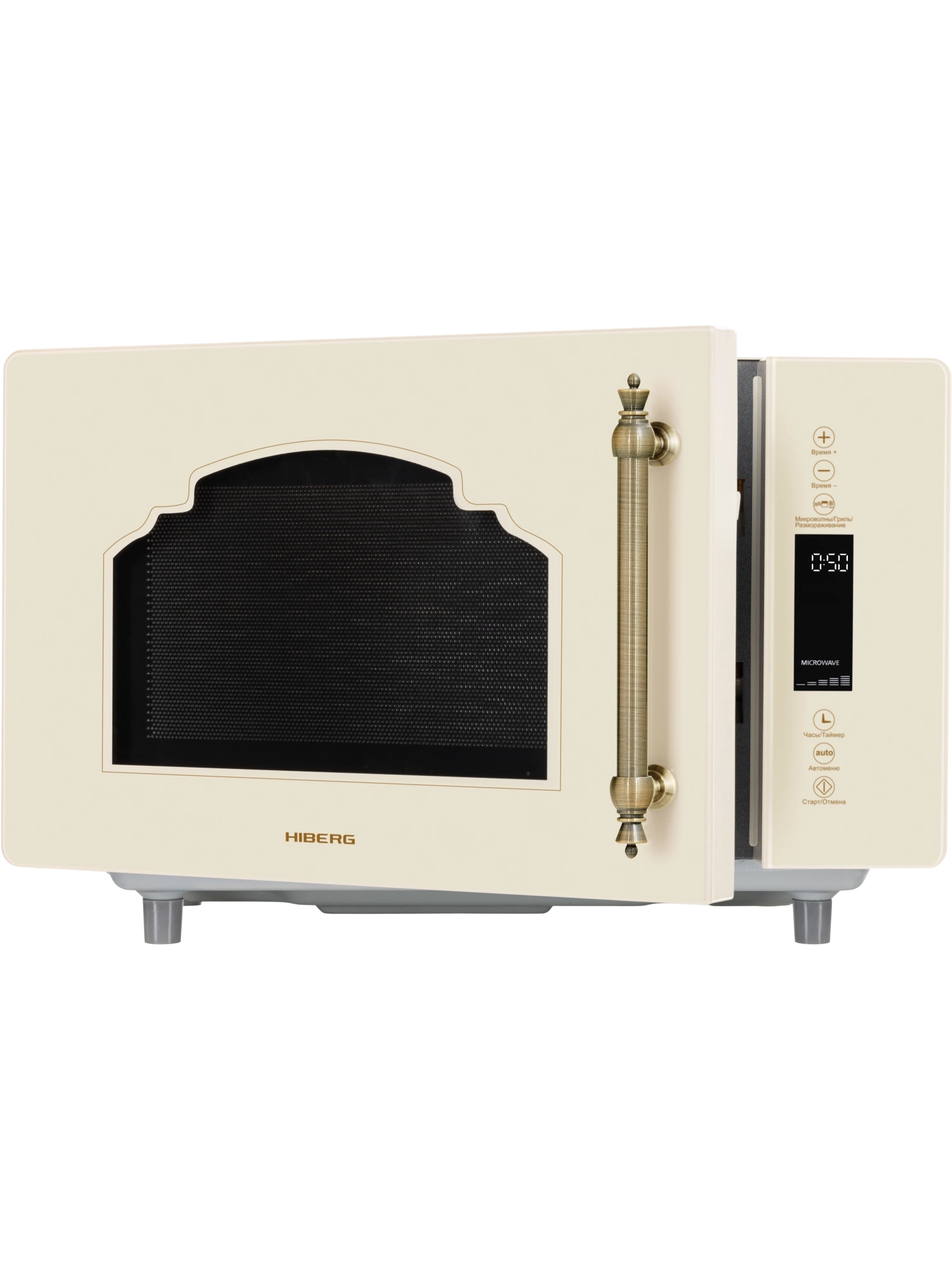 Микроволновая печь HIBERG i-VM 4588 YR с инверторной технологией работы имеет объем 25 литров, стеклокерамическое дно без поворотного стола, сенсорное управление, таймер и безопасный кварцевый гриль. Микроволновая печь выполнена в ретро дизайне, поэтому прекрасно впишется в интерьер кухни в классическом стиле, кантри или Прованс. Фасад микроволновой печи выполнен полностью из закаленного стекла бежевого цвета. Удобная металлическая ручка выгодно подчеркивает цвет и фактуру модели. Инновационная особенность микроволновой печи — инверторная технология работы, которая обеспечивает многоуровневое управление мощностью микроволн и равномерное распределение тепла по всему пространству камеры. За счет этого блюдо прогревается быстро и со всех сторон, сохраняя аппетитный вид, полезные и вкусовые качества. Кроме того, благодаря инверторной технологии можно не только разогревать пищу, но также размораживать продукты и полноценно их готовить. Микроволновая печь имеет высокий уровень энергоэффективности и отличается долгим сроком службы. Еще одно уникальное преимущество модели — стеклокерамическое дно без поворотного стола. Оно простое в уходе и безопасно в использовании, на гладкую поверхность можно поставить посуду любой формы и размеров, а также разогревать несколько блюд одновременно. Камера внутри имеет эмалированное покрытие, устойчивое к механическим повреждениям, удобное в уходе и очистке. Объем камеры микроволновой печи в 25 литров и мощность микроволн 900 Вт позволяют быстро и легко разогреть или приготовить любое блюдо. Электронное управление позволяет с легкостью регулировать мощность и время приготовления продуктов, выбирать необходимый режим, устанавливать таймер на запуск и окончание приготовления блюда. Безопасный кварцевый гриль мощностью 1200 Вт идеально подойдет для приготовления блюд из мяса с хрустящей золотистой корочкой, а также горячих сэндвичей и овощей. По своим свойствам кварцевый гриль имитирует эффект открытого огня, поэтому в этом режиме продукты обжариваются быстрее и получаются вкуснее. В комплект входит специальная хромированная подставка для приготовления блюд с помощью гриля. С помощью функции «Таймер» можно настроить запуск и окончание приготовления в микроволновой печи с заранее установленным временем. Гарантия на микроволновую печь HIBERG – 2 года.