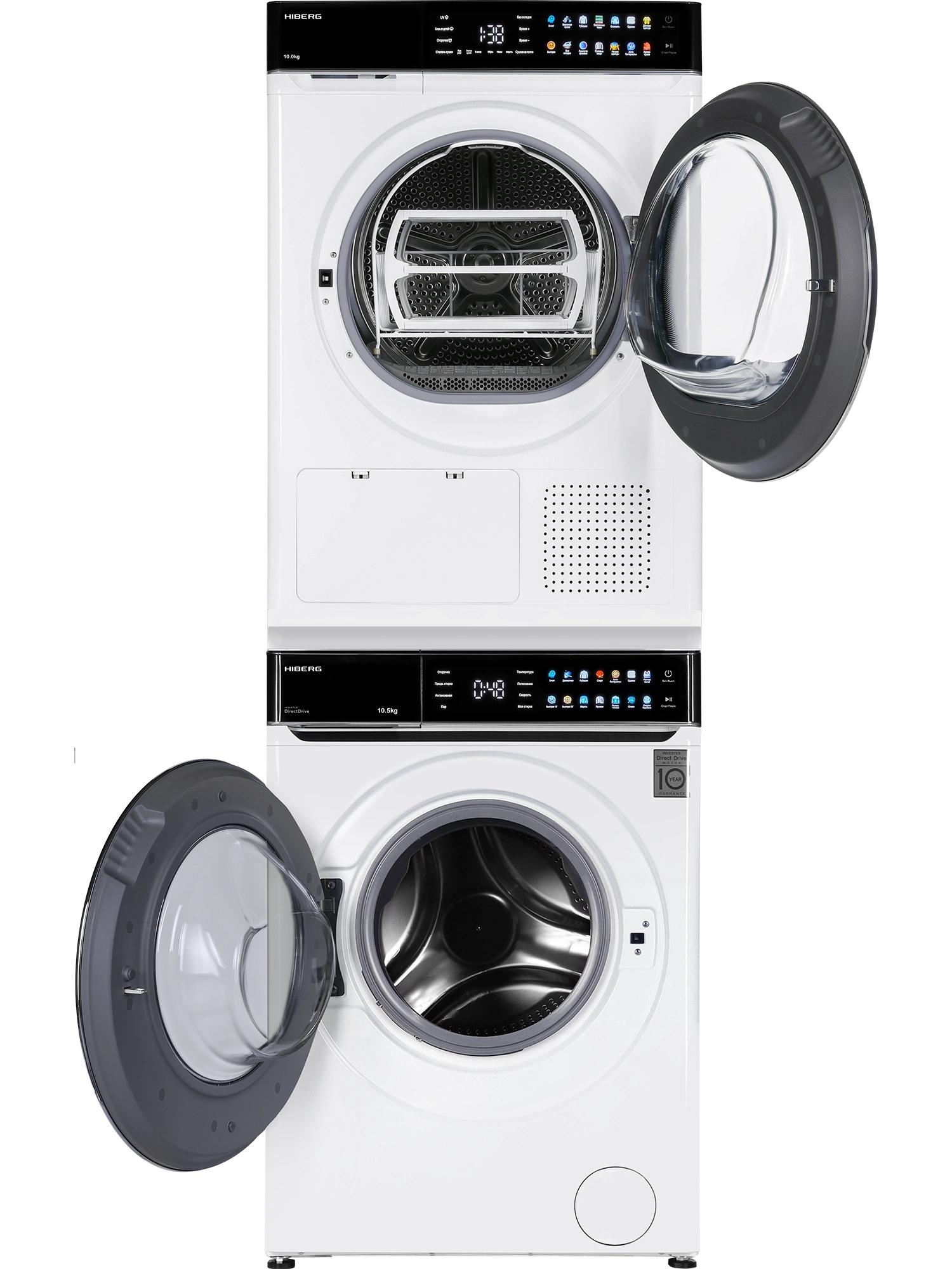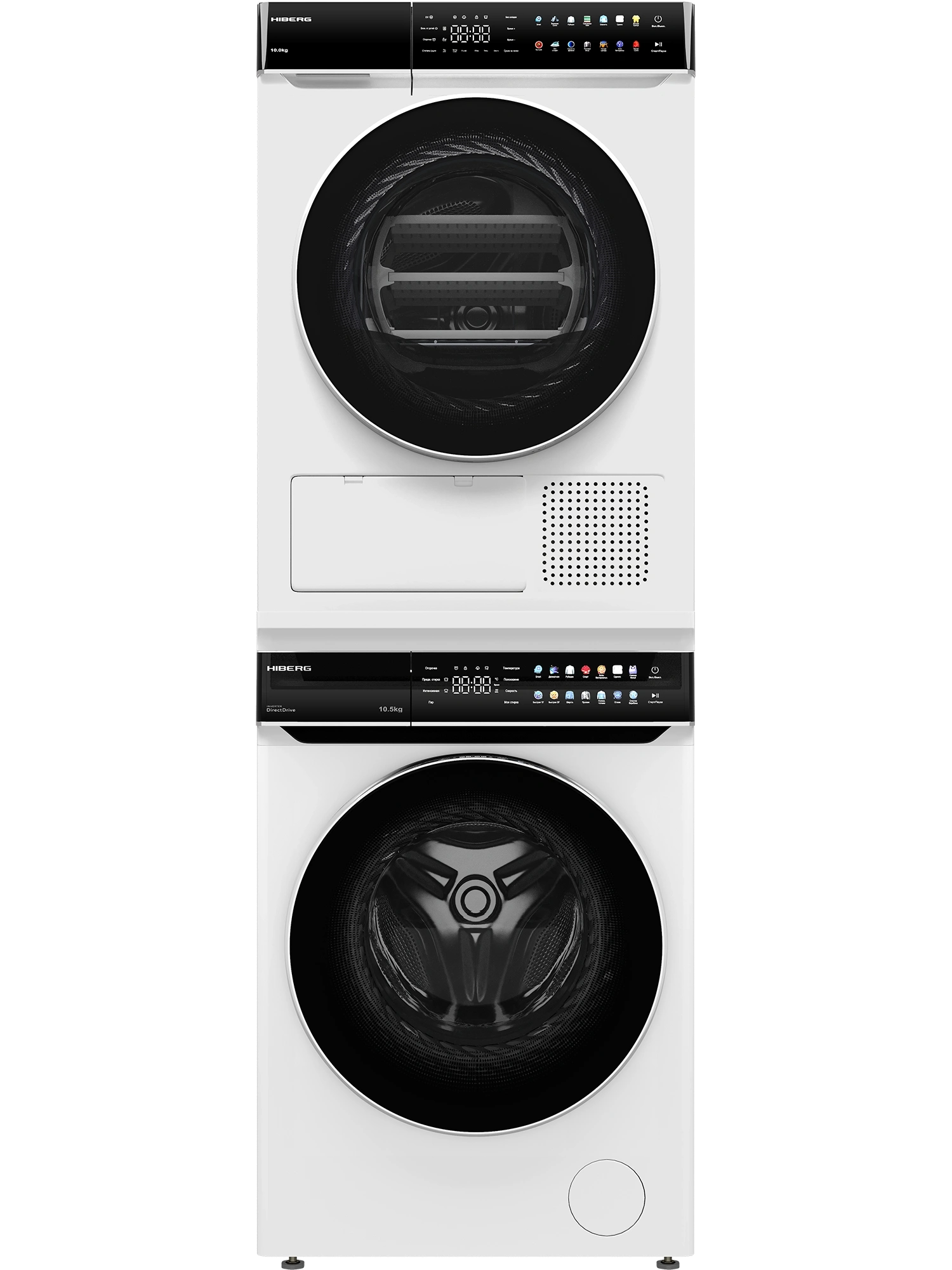 Комплект для установки в колонну от HIBERG, состоящий из стиральной машины I-DDQ11 - 1014 W, сушильной машины HDQ11 - 10 W и соединительного элемента, — это удобное решение для большой семьи, позволяющее более эффективно использовать полезное пространство в ванной или прачечной, а также запускать два цикла одновременно. Сушильная машина устанавливается как отдельностоящая, так и в колонну со стиральной машиной с помощью специальной соединительной планки, которая приобретается дополнительно. Колонна из сушильной и стиральной машины имеет стильный дизайн, выполнена в классическом белом цвете. Модель прекрасно впишется в любой интерьер ванной или прачечной. Сушильная машина Сушильная машина HIBERG оснащена тепловым насосом: через него проходит отработанный влажный воздух. Влага конденсируется и отводится в лоток для воды, а воздух повторно нагревается для дальнейшей обработки белья. Это обеспечивает эффективную и бережную сушку белья без риска деформации и повреждения тканей. Сушильная машина вмещает и эффективно высушивает до 10 кг за цикл. Вы сможете обработать большое количество одежды за одну загрузку, при этом экономя время и электроэнергию. Барабан машины имеет внутреннюю подсветку, с которой удобно контролировать процесс сушки. С помощью сенсорной панели управления с цветным LED-дисплеем можно установить оптимальную программу, выбрать время и этап сушки. Вы можете настроить степень высушивания и объем загрузки, отложить начало сушки с помощью таймера от 3 до 24 часов, а также исключить случайный сброс настроек, активировав функцию «Блокировка от детей». В сушильной машине 14 программ сушки текстиля любого типа: для смешанных и деликатных тканей, детской одежды, шерстяных изделий, одеял и пуховиков. Программа Smart позволяет оптимизировать процесс сушки в зависимости от загрузки и типа белья. Вы сможете управлять сушильной машиной буквально в одно касание. Также в устройстве есть такие полезные программы: «Без складок», «Бережная сушка», «Сушка по времени», «Нагрев одежды», «Освежить», «Антибактериальная», «Быстрая», «Аромасушка» и «Сушка на полке» для обработки головных уборов, обуви и детских игрушек. Функция «Выбор степени сушки» подготовит вашу одежду для дальнейшего хранения или носки: «Под утюг» (белье немного влажное, но хорошо поддается глажке), «Экстрасухая одежда» (можно носить сразу после сушки), «В шкаф» (очень сухие вещи, которые можно сложить в шкаф). Дополнительная функция «Стерилизация ультрафиолетом» обеспечивает идеальную чистоту белья и надежную защиту от бактерий и микробов. Стиральная машина Стиральная машина HIBERG с инверторным мотором и системой прямого привода оснащена многими инновационными функциями и возможностями для стирки белья. Максимальная загрузка — до 10,5 кг сухого белья за цикл. Высокий класс энергоэффективности А+++ гарантирует минимальные затраты воды и электроэнергии. Скорость отжима 1400 оборотов в минуту уменьшает продолжительность дальнейшей сушки белья. Сенсорная панель управления позволяет установить оптимальную программу, отрегулировать температуру и скорость отжима. На цветном LED-дисплее в виде световой индикации отражается вся информация по выбранной программе и типу стирки: таймер, температура воды, скорость отжима, количество циклов полоскания, время отложенного старта и код 