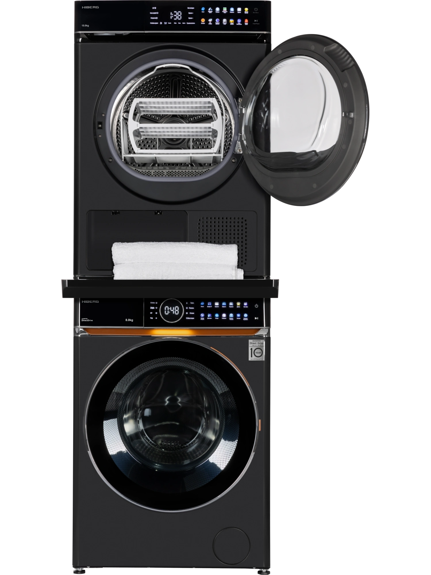 Комплект для установки в колонну от HIBERG, состоящий из стиральной машины i-DDQ10 - 814 B, сушильной машины HDQ11 - 10 B и соединительного элемента, — это удобное решение для большой семьи, позволяющее более эффективно использовать полезное пространство в ванной или прачечной, а также запускать два цикла одновременно. Сушильная машина устанавливается как отдельностоящая, так и в колонну со стиральной машиной с помощью специальной соединительной планки, которая приобретается дополнительно. Колонна из сушильной и стиральной машин выполнена в стильном дизайне и привлекательном черном цвете. В таком исполнении модель прекрасно впишется в любой интерьер ванной или прачечной. Сушильная машина Сушильная машина HIBERG оснащена тепловым насосом: через него проходит отработанный влажный воздух. Влага конденсируется и отводится в лоток для воды, а воздух повторно нагревается для дальнейшей обработки белья. Это обеспечивает эффективную и бережную сушку белья без риска деформации и повреждения тканей. Сушильная машина вмещает и эффективно высушивает до 10 кг за цикл. Вы сможете обработать большое количество одежды за одну загрузку, при этом экономя время и электроэнергию. Барабан машины имеет внутреннюю подсветку, с которой удобно контролировать процесс сушки. С помощью сенсорной панели управления с цветным LED-дисплеем можно установить оптимальную программу, выбрать время и этап сушки. Вы можете настроить степень высушивания и объем загрузки, отложить начало сушки с помощью таймера от 3 до 24 часов, а также исключить случайный сброс настроек, активировав функцию «Блокировка от детей». В сушильной машине 14 программ сушки текстиля любого типа: для смешанных и деликатных тканей, детской одежды, шерстяных изделий, одеял и пуховиков. Программа Smart позволяет оптимизировать процесс сушки в зависимости от загрузки и типа белья. Вы сможете управлять сушильной машиной буквально в одно касание. Также в устройстве есть такие полезные программы: «Без складок», «Бережная сушка», «Сушка по времени», «Нагрев одежды», «Освежить», «Антибактериальная», «Быстрая», «Аромасушка» и «Сушка на полке» для обработки головных уборов, обуви и детских игрушек. Функция «Выбор степени сушки» подготовит вашу одежду для дальнейшего хранения или носки: «Под утюг» (белье немного влажное, но хорошо поддается глажке), «Экстрасухая одежда» (можно носить сразу после сушки), «В шкаф» (очень сухие вещи, которые можно сложить в шкаф). Дополнительная функция «Стерилизация ультрафиолетом» обеспечивает идеальную чистоту белья и надежную защиту от бактерий и микробов. Стиральная машина Стиральная машина HIBERG с инверторным мотором и системой прямого привода оснащена многими инновационными функциями и возможностями для стирки белья. Максимальная загрузка — до 8 кг сухого белья за цикл. Высокий класс энергоэффективности А+++ гарантирует минимальные затраты воды и электроэнергии. Скорость отжима 1400 оборотов в минуту уменьшает продолжительность дальнейшей сушки белья. Сенсорная панель управления позволяет установить оптимальную программу, отрегулировать температуру и скорость отжима. На цветном LED-дисплее в виде световой индикации отражается вся информация по выбранной программе и типу стирки: таймер, температура воды, скорость отжима, количество циклов полоскания, время отложенн