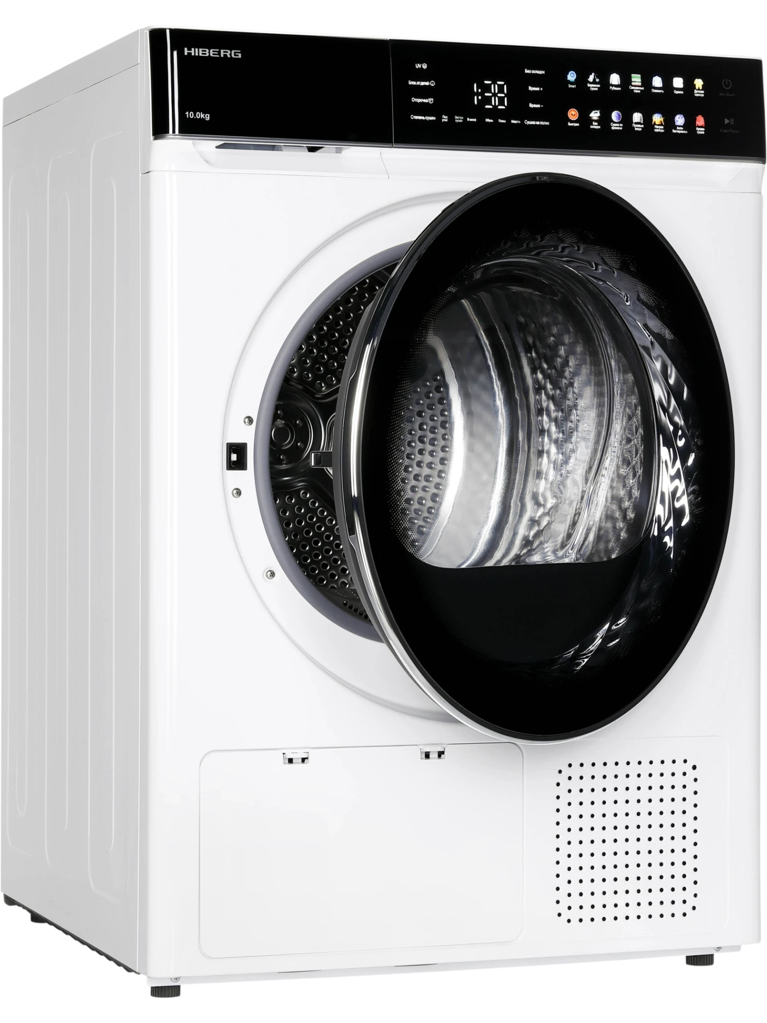 Сушильная машина HIBERG HDQ11 – 10 W с тепловым насосом – это высокотехнологичное решение для вашего дома, которое позволяет вместить и эффективно высушить до 10 кг белья за один цикл. Вы сможете сушить большее количество одежды за одну загрузку, при этом экономя время и электроэнергию. Стильное и современное устройство выполнено в классическом белом цвете с черным люком и цветной панелью управления. В таком исполнении сушильная машина идеально впишется в любой интерьер вашей ванной или прачечной. Кроме того, модель имеет возможность установки в колонну со стиральной машиной HIBERG i-DDQ11 - 1014 W для экономии пространства в помещении. Сушильная машина оснащена тепловым насосом: отработанный влажный воздух не выводится за пределы прибора, а проходит через специальный тепловой насос. Влага конденсируется и отводится в лоток для воды, а воздух повторно нагревается для дальнейшей обработки белья. Это обеспечивает эффективную и бережную сушку белья без риска деформации и повреждения тканей. Панель управления: С помощью сенсорной панели управления можно установить специальную программу сушки с предустановленными настройками, выбрать время и степень сушки. На цветном LED-дисплее световой индикацией отражается вся информация по выбранной программе, что позволяет легко подобрать оптимальные параметры в зависимости от вида материала и типа вещей. Вы можете настроить степень высушивания и объем загрузки, отложить начало сушки с помощью таймера от 3 до 24 часов, а также исключить случайный сброс настроек, активировав функцию «Блокировка от детей». Программы и функции: В сушильной машине 14 программ сушки текстиля любого типа: смешанных и деликатных тканей, детской одежды, шерстяных изделий, одеял и пуховиков. Программа Smart позволяет оптимизировать процесс сушки в зависимости от загрузки и типа белья. Вы сможете управлять сушильной машиной в одно касание и наслаждаться свободным временем. Программа «Без складок» (сушка под утюг) – во время сушки при высокой температуре 52°C ткань остается слегка влажной для легкого разглаживания утюгом. Программа «Бережная сушка» при низкой температуре предотвращает усадку тонких тканей, таких как шелк, шифон, а также шерсти и кашемира. «Быстрая» программа сушки применяется для натуральных тканей, не дающих сильную усадку. Она подходит, когда нет времени ждать и нужно высушить одежду как можно скорее. «Сушка по времени» – для достижения необходимой степени сушки можно индивидуально настроить длительность цикла программы. Программа «Нагрев одежды» сделает вещи теплыми. Перед выходом на улицу зимой положите одежду в сушильную машину. Программа «Освежить» удалит запахи с чистой и сухой одежды в течение 40 минут. «Антибактериальная» программа сушки эффективно уничтожает бактерии и аллергены глубоко в волокнах тканей, обеспечивая гигиеническую защиту. Программа подходит для долго хранящейся одежды, требующей стерилизации. Программа «Аромасушка» придает приятный запах и подходит для любого типа белья. Блок аромасушки устанавливается в сетевой фильтр барабана и приобретается дополнительно. Функция «Выбор степени сушки» подготовит вашу одежду для дальнейшего хранения или носки: «Под утюг» (белье немного влажное, но хорошо поддается глажке), «Эстра сухая одежда» (можно носить сразу после сушки), «В шкаф» (