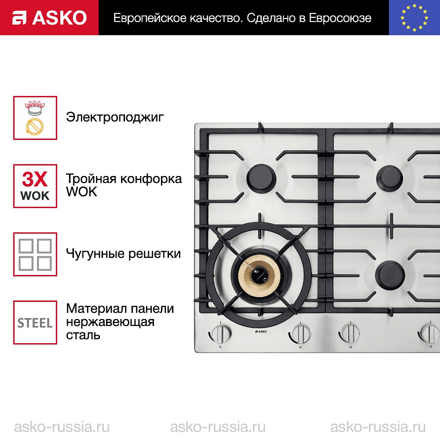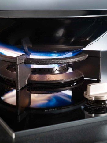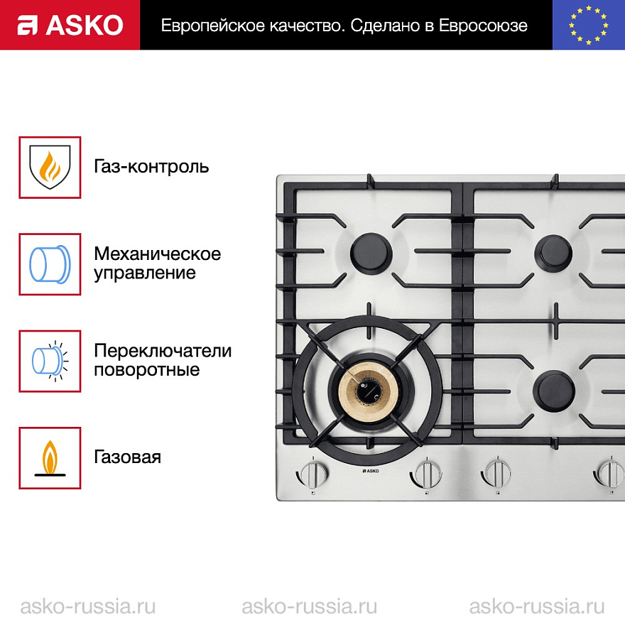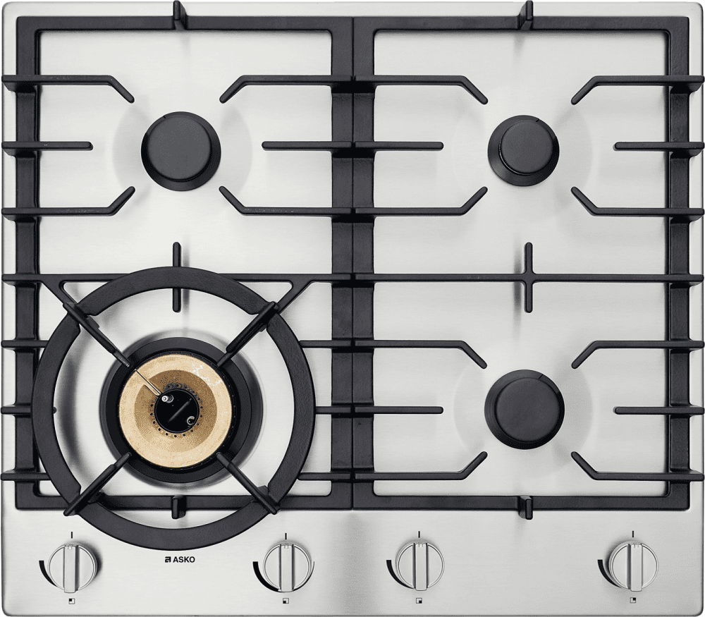 Поворотные устройства управления расположены равномерно по всей ширине варочной панели Аско HG1666SB, чтобы исключить риск соприкосновения с горячей посудой. Включение и управление газом осуществляется механическими поворотными ручками. Для приготовления блюд оборудование располагает 4 конфорками — одна мощностью 1 кВт, две мощностью 2 кВт и одна 4,2кВт. Последняя из них обладает тремя кольцами пламени. Вы сможете создать атмосферу ресторана на домашней кухне и готовить блюда азиатской кухни в специальных сковородах-вок, использовать казан и другую посуду с толстыми стенками.