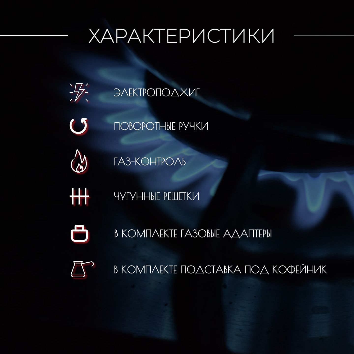 Управление спереди, Ручки с электроподжигом, Газ-контроль, Колпачки горелок, Газовые адаптеры, Чугунные решетки