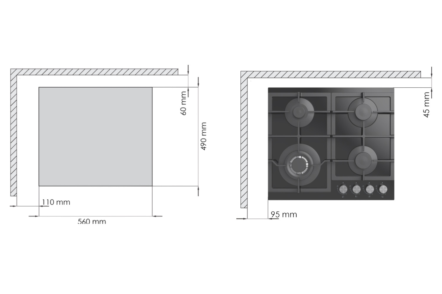Горелки: • 2 х 1.7 кВт • 1 х 0.9 кВт • 1 х 3.8 кВт (WOK – с тройным рядом пламени)