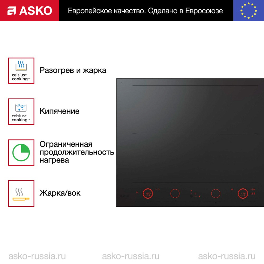 Варочная панель Аско HID654MC позволяет две соседние конфорки объединять в одну большую. Таким образом создаётся зона нагрева, которую можно использовать для приготовления на утятнице, гриль-сковороде, рыбоварке и прочее. Для управления кухонным девайсом используется сенсорная панель, обладающая впечатлительной чувствительностью. Она достаточна проста в освоение, поэтому будет понятна абсолютно каждому пользователю. Автоматика приготовления поможет избежать выкипания, потому что некоторое время после включения индукционная катушка работает с максимальной мощностью, затем интенсивность уменьшается до заранее выбранных параметров. Вам не нужно находиться рядом, чтобы убавлять нагрев.