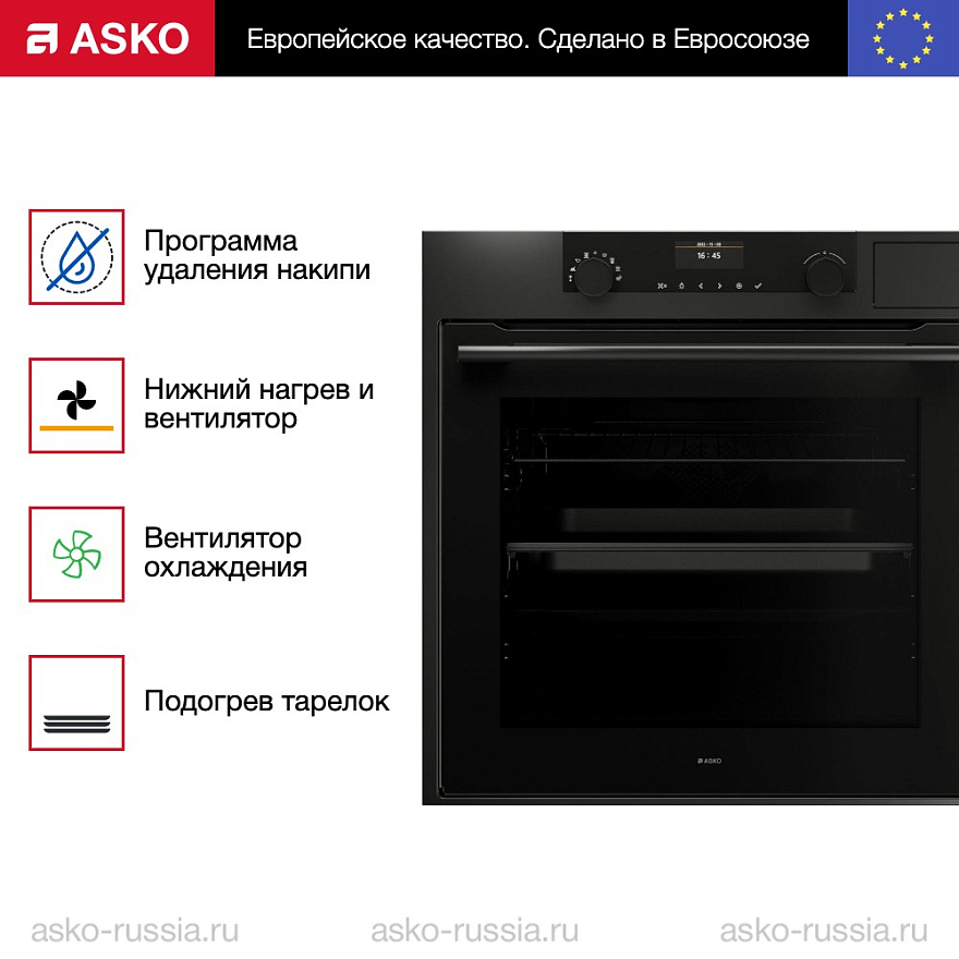 Основные характеристики прибора включают доводчик Dual Soft Close для плавного открывания и закрывания дверцы, термощуп, который идет в комплекте и позволяет контролировать температуру приготавливаемого блюда, а также программу очистки AquaClean, использующую пар для размягчения жира и других отложений на стенках духовой камеры. Прибор поддерживает 11 различных режимов нагрева, включая гриль и конвекцию. Внутри есть резервуар с водой — не понадобится доливать ее в процессе приготовления. Подогрев посуды и блюд Stay Warm обеспечивает правильную температуру пищи при подаче на стол.