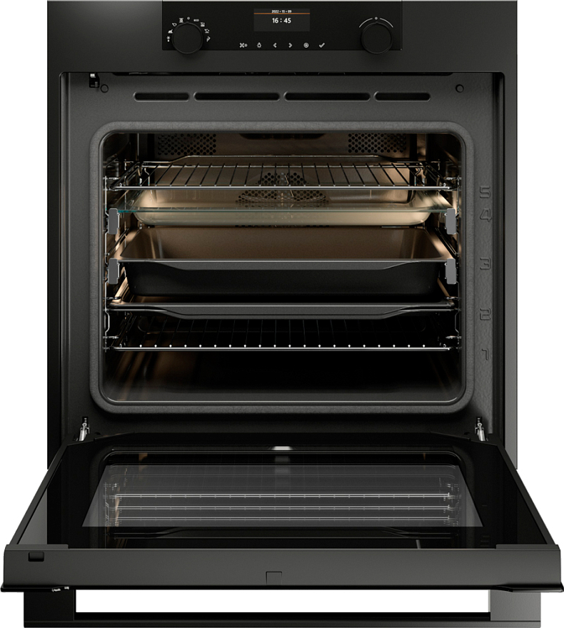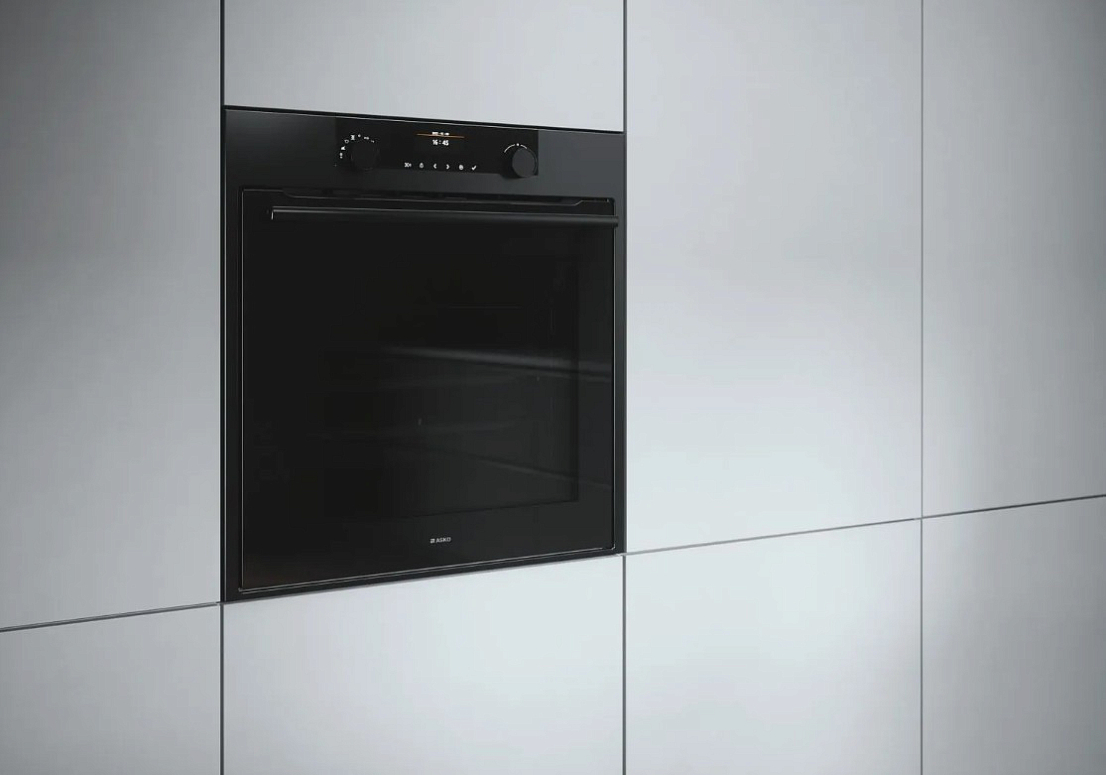 Корпус выполнен в цвете «антрацит». Управление сенсорное, переключатели блокируются от детей, чтобы не получилось случайно сбить настройки. Внутри духовой шкаф Аско OP8664A1 отделан пиролитической эмалью, которая выдерживает даже экстремально высокие температуры. Очистка тоже пиролитическая. Нужно лишь выбрать режим и запустить духовку. Внутри температура повышается до 400 градусов. Все загрязнения сгорают, нужно только убрать остатки сажи мягкой тканью. Четырехслойное остекление дверцы позволяет ей оставаться холодной даже при работе духового шкафа в режиме максимального нагрева.
