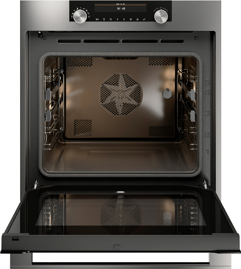Простоту поддержания чистоты обеспечивает наличие пиролитической очистки. Во время ее выполнения температура внутри духовки достигает максимальных значений и все загрязнения превращаются в пепел, который легко удалить при помощи влажной салфетки. Стенки покрыты специальной эмалью, рассчитанной на такой уровень тепла, также в комплект входит противень с таким же покрытием.