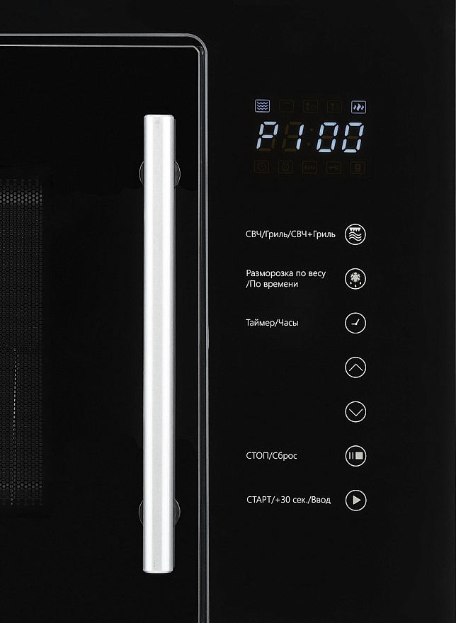 Имеются размораживание по весу или по времени, а также электрический гриль. В комплекте идут: стеклянный поворотный поддон и решетка для гриля. Управление осуществляется с помощью сенсорного дисплея. На дисплей выводится информация о выбранном режиме. Устройство характеризуется удобством эксплуатации, ко встроенным функциям также относится быстрый старт, составляющий ± 30 секунд. С помощью таймера на 95 минут вы можете запрограммировать приготовление блюда из мяса на семью из 3–4 человек и установить время для автоматического выключения прибора. Подсветка камеры обеспечит комфортное использование и позволит следить за процессом приготовления.